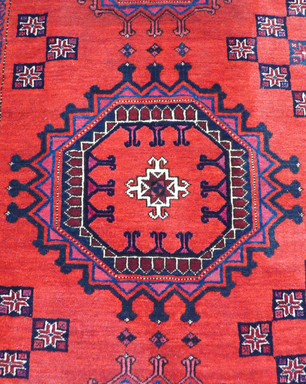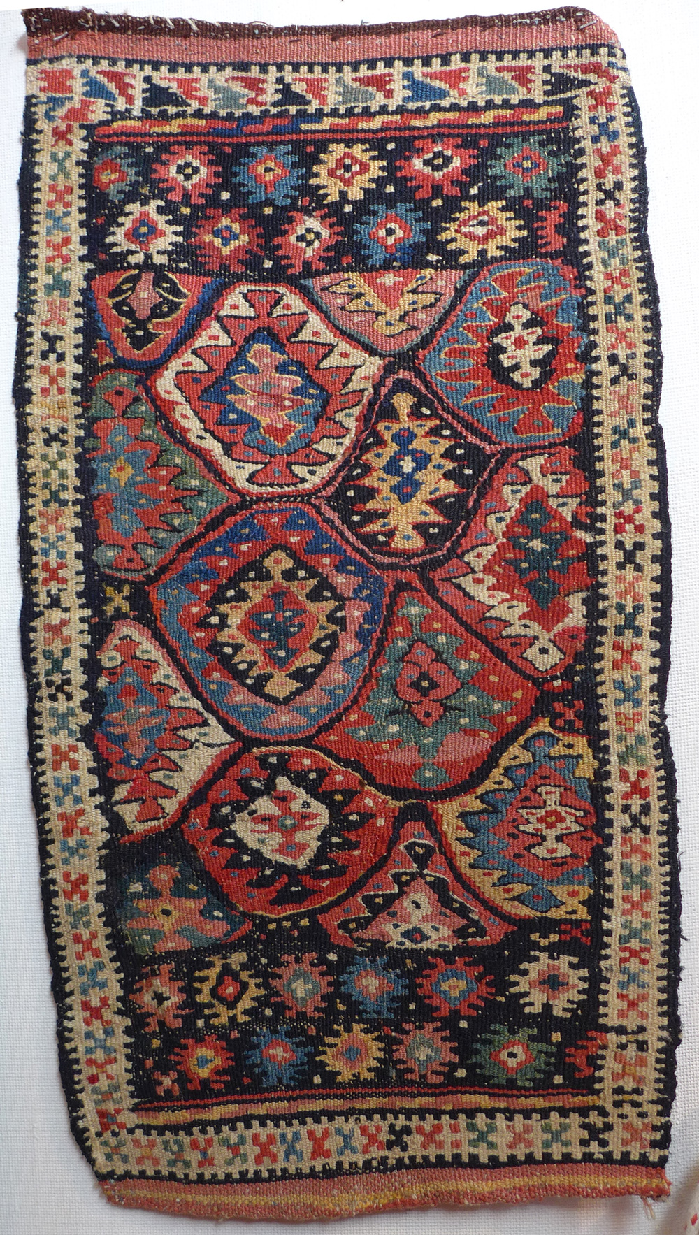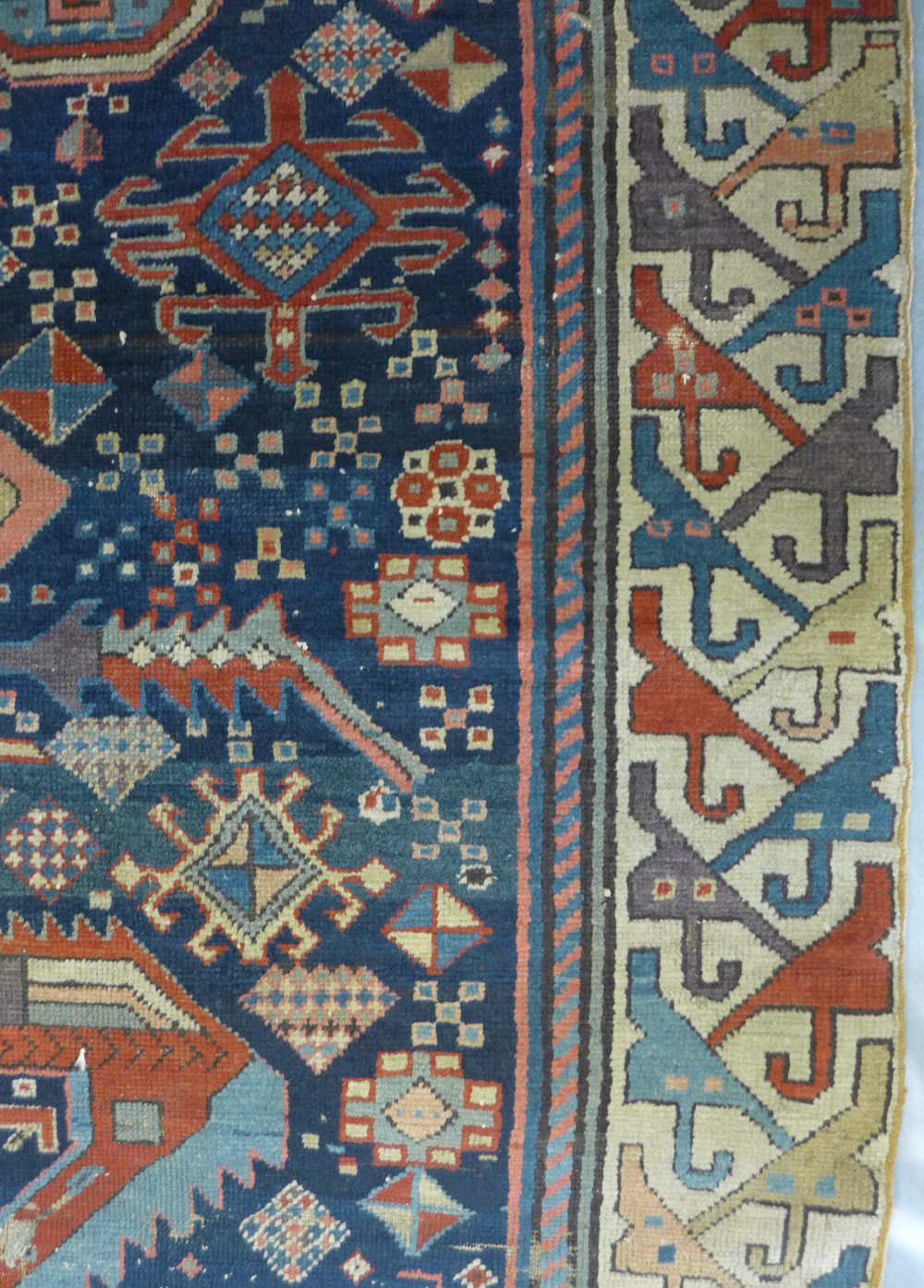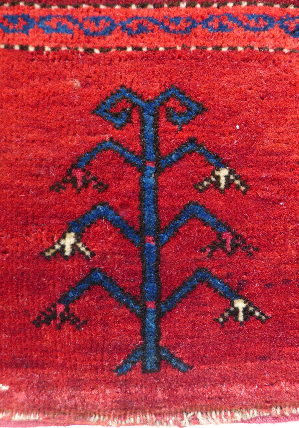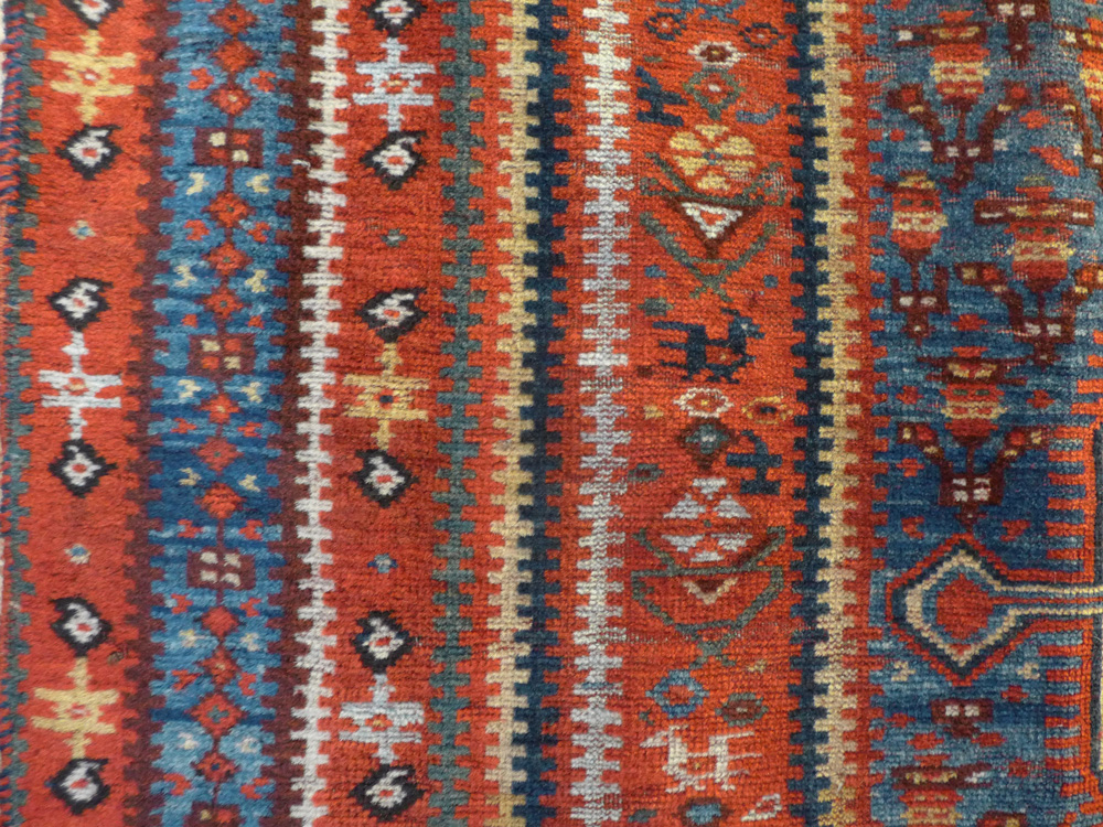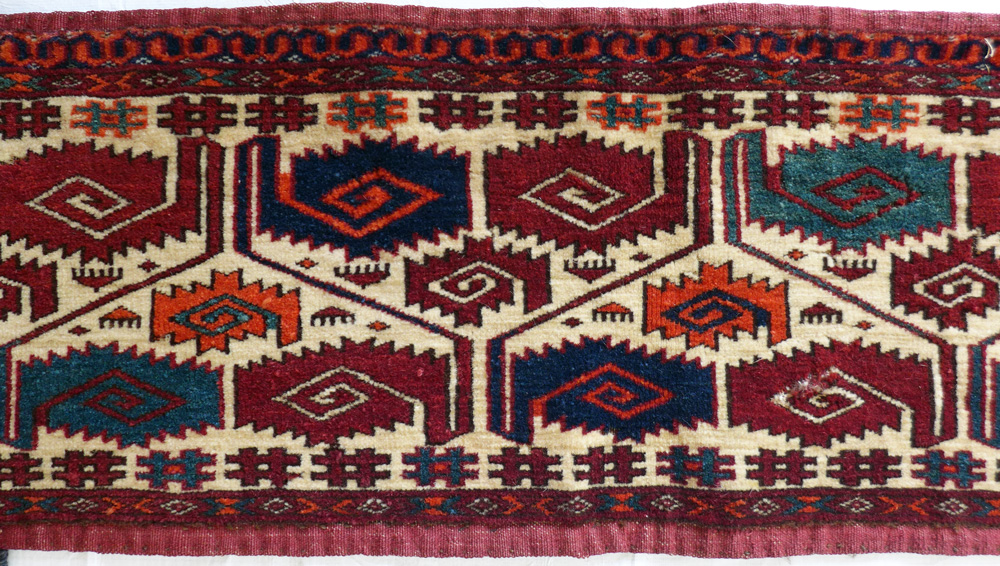 - Khamseh (detail), SW Persia, circa 1875, a pile rug with a border design usually seen on slit weave kelims at Richard Purdon’s shop, Burford