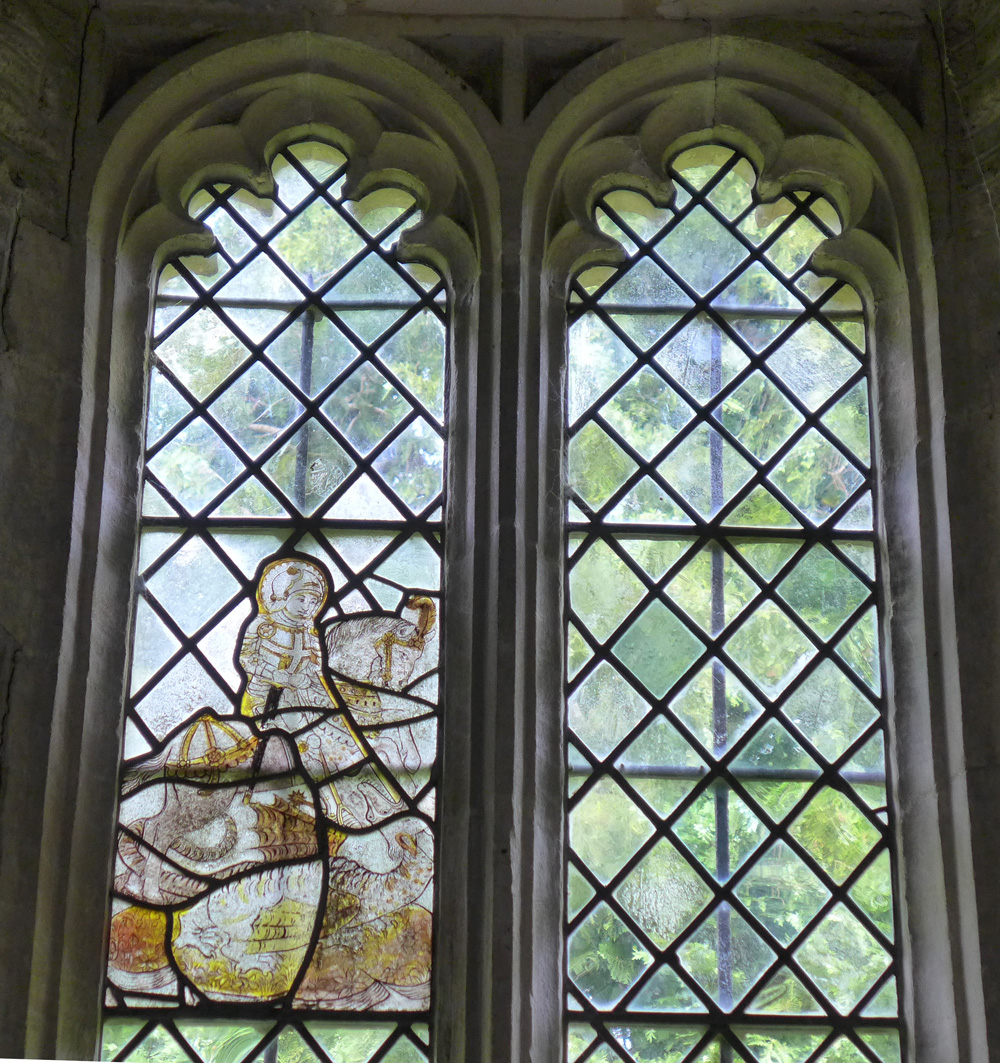 - St George and the Dragon, medieval stained glass, 14th century, Kelmscott Chapel, Gloucestershire