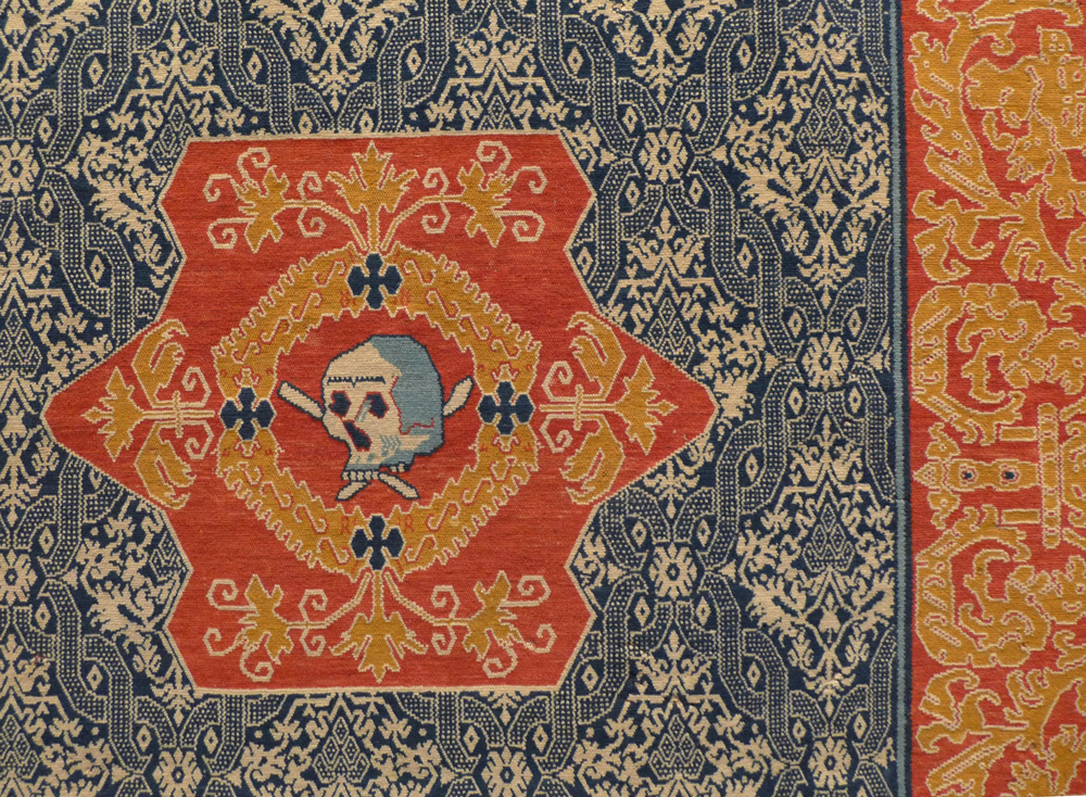 - Alcaraz (?) carpet (detail), Spain, 1550 – 1600, V&A, London. On view in the Renaissance galleries the fine weave and low cut pile could easily lead someone to believe that this is a velvet on first glance. The four medallions containing skulls are memento mori. 250-1906