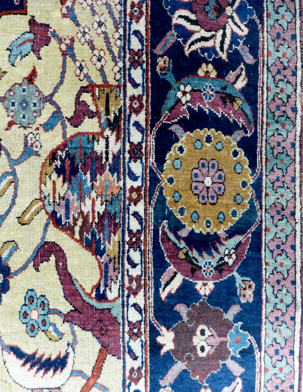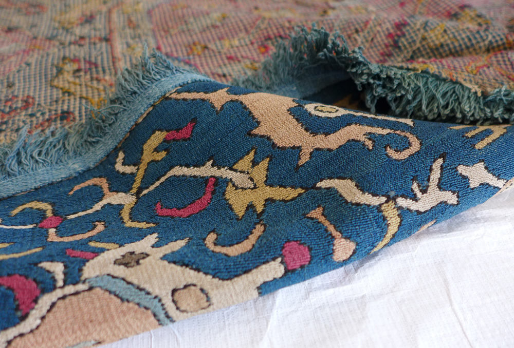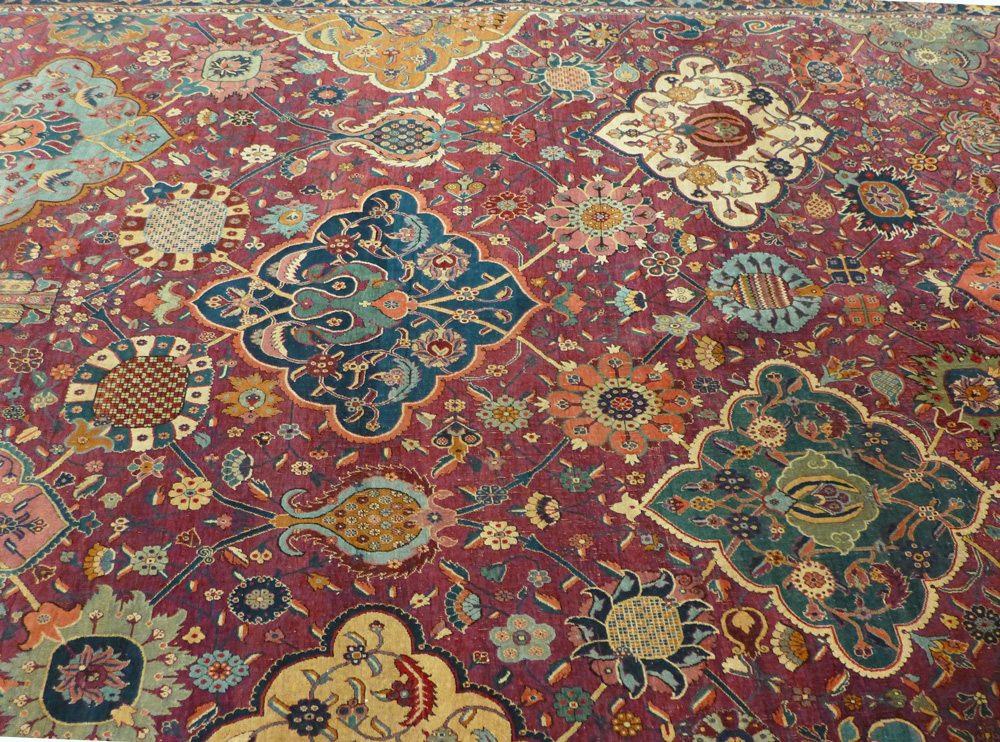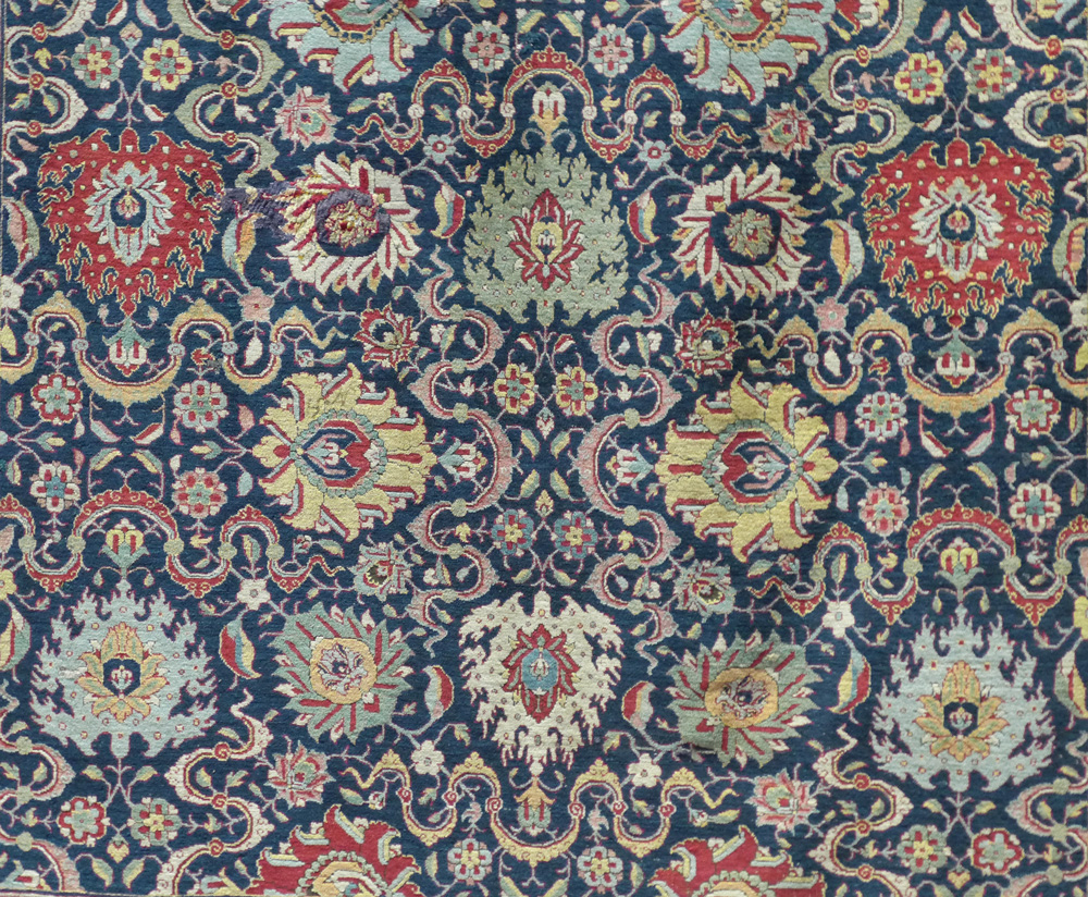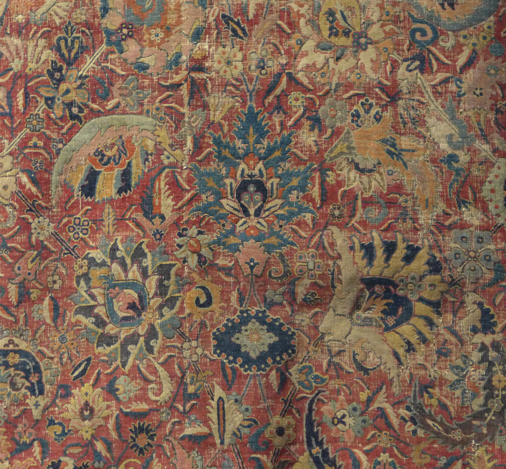 - A detail from a rarely seen but huge (2.895 x 7.49m (114″ x 295″) and complete Vase technique carpet (detail), east Persia, 17th century, at the Clothworkers’ Centre at Blythe House in Olympia, London. 127.1884