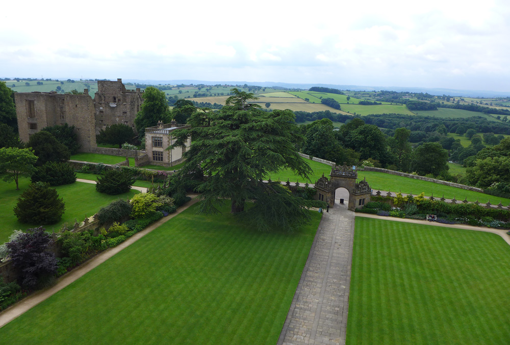 - View from the roof looking across to the ruin of the old hall, Hardwick Hall, Derbyshire
