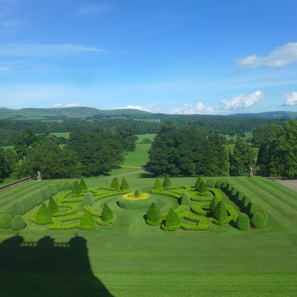 - Formal gardens seen from the window of Drumlanrig Castle, Dumfries & Galloway, Scotland