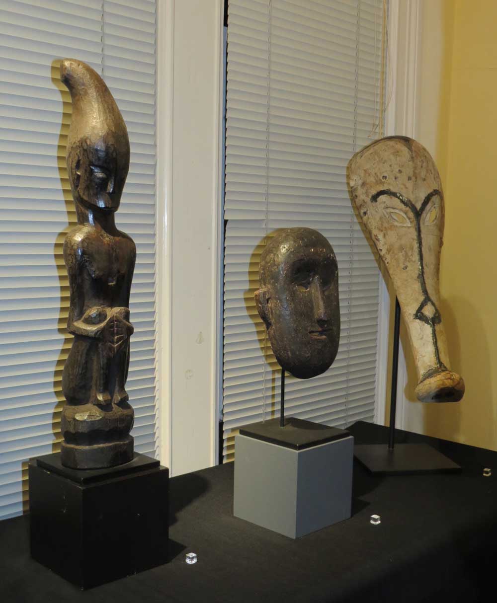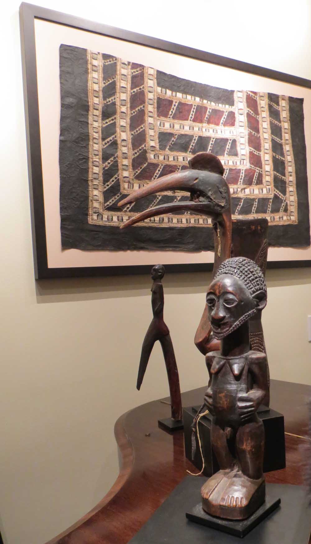 5. A framed Pacific tapa cloth hangs above African sculptures of James Willis, African art